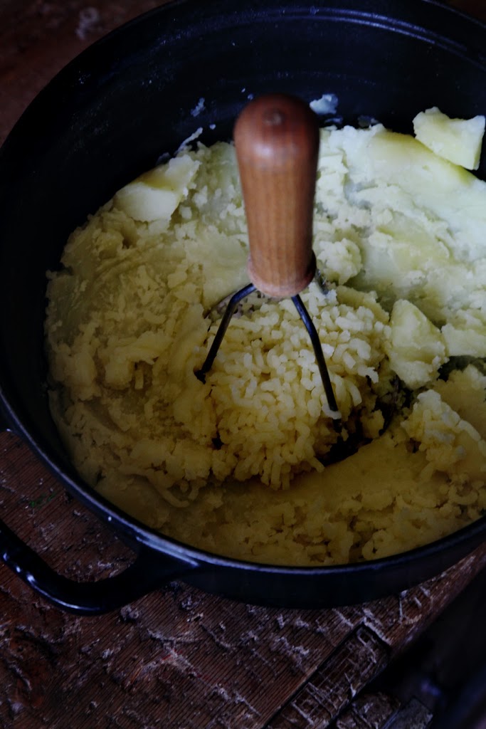 Mash the potatoes with a potato masher. When properly mashed, place the potatoes in a large pan and start the heat on low, stirring for 2 minutes to ‘dry up’ the mash.