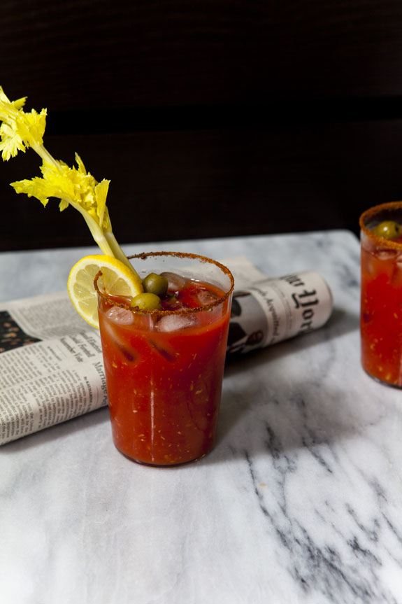 My dear friend is a bartender on the Lower East Side, and she makes what I think are the best Bloody Marys. I visit her often to sip on one of her perfect concoctions, sometimes even without the vodka. There is something so satisfying about the salty, spicy tomato juice that I just love and crave. Her twist: the addition of Old Bay. And while some recipes call for more Worcestershire, I like to go heavy on the lemon juice, olive juice and horseradish. My ideal afternoon? These Bloody Marys and a dozen oysters.