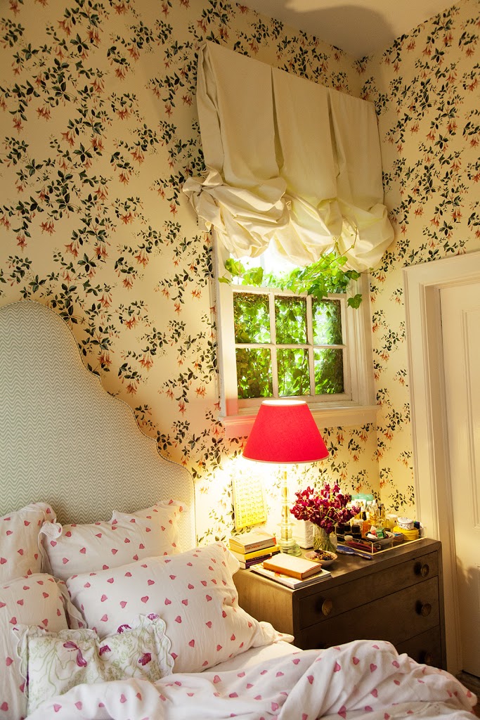 “Beds are obviously the center of bedrooms, but this bed is even more so, since it takes up most of the room, which measures 6.5 feet by 8 feet! I had never seen a bedroom as small as this one…but being “all bed” actually made it rather lovely, especially once the wallpaper went up. The wallpaper, which is so feminine, opened up the room enormously; before it went up, the room was like a cell, its white walls terribly enclosing. But now it feels like sleeping and waking in an old-fashioned greenhouse. Of course, the window helps—windows are such an important element of a room. When I am looking for a place to live, I always use the windows as a guide. If you are getting sidetracked by the way the place is decorated and can’t see past the style (or lack thereof), look at the windows. If they are good, and the room is a good shape, you will always be able to make it lovely.”