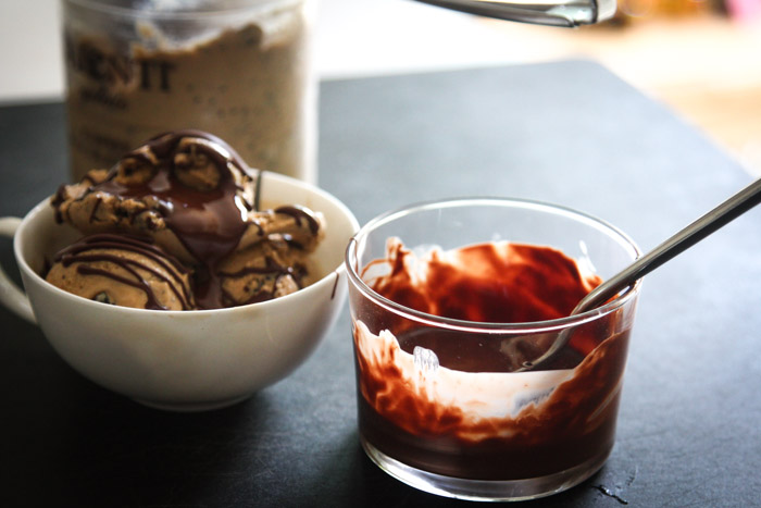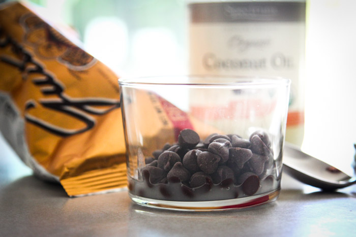 The ratio should be about 2:3 coconut oil to chocolate. Combine the two ingredients in a microwave-safe glass, and, to make a single serving, I’d recommend starting at 30 seconds in the microwave and then stirring. As soon as you have a silky, melted chocolate you’re ready to go. (Just be careful when you pull it out to check, because the oil will be hotter than the chocolate.)