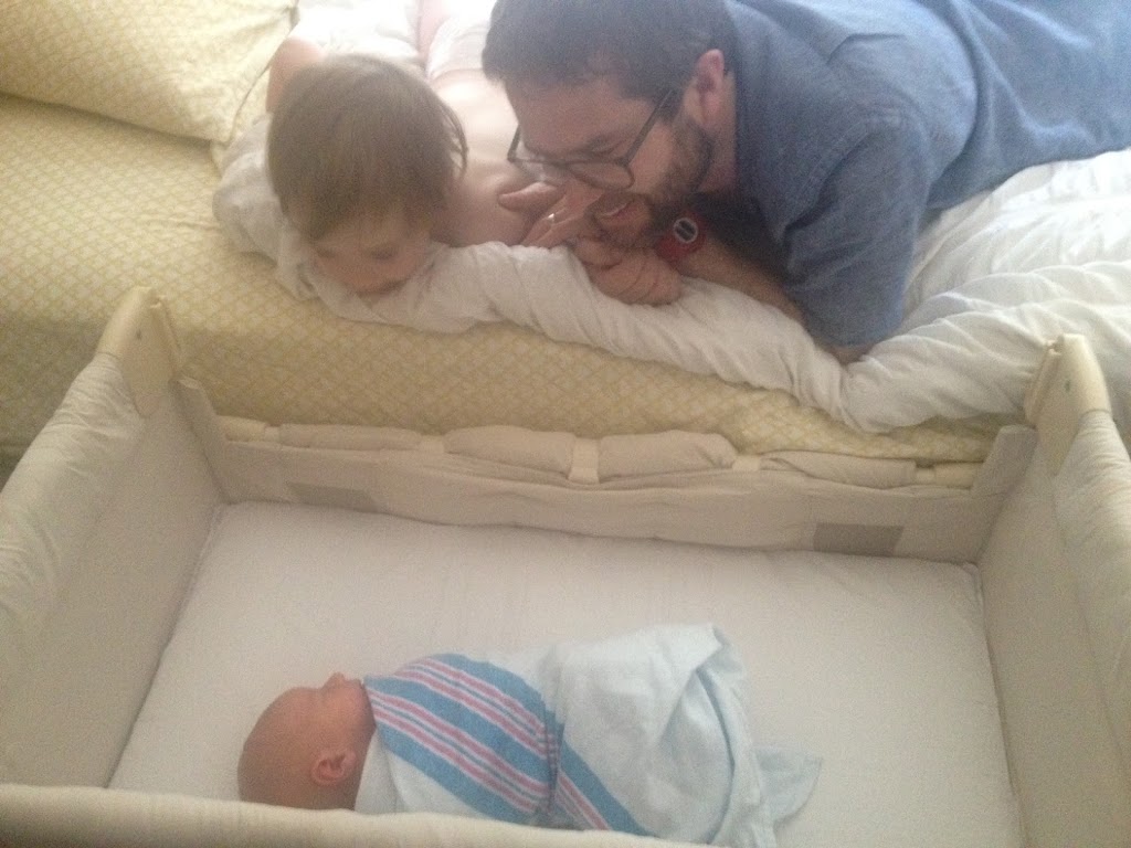 The day after Anton was born, Alex brought an excited Toby to the hospital. A bunch of readers had recommended not holding the baby when the older child arrives; just put the baby in the bassinet and have your arms open to greet your older child. We did just that, and it worked well.