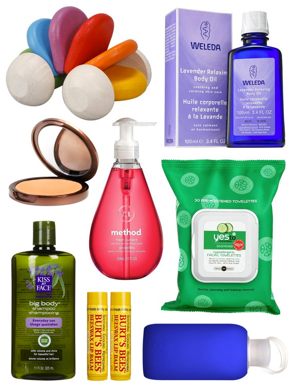 (Products above: Toy car, lavender body oil, facial towelettes, water bottle, lip balm, shampoo, hand wash and bronzer).