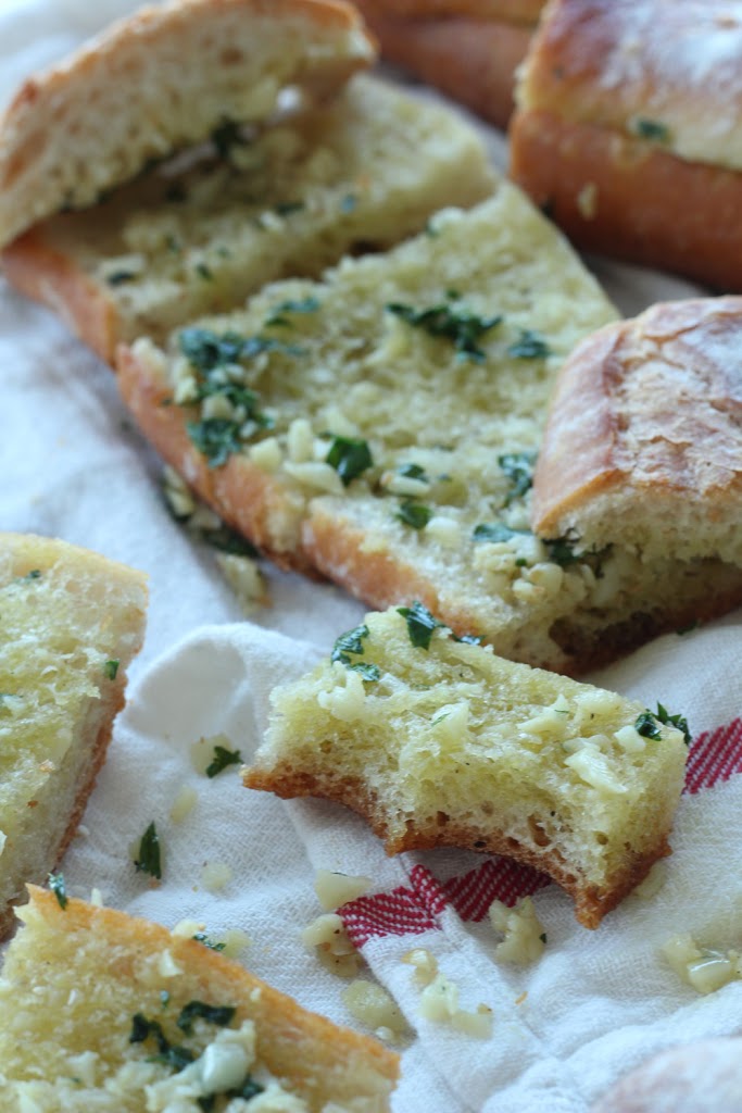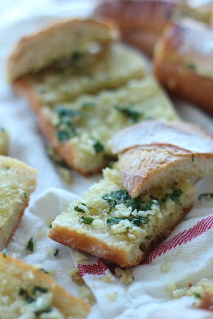 I grew up in a strictly homemade garlic bread household. It wasn’t until I was 12 or 13 and eating dinner at a friend’s house that I was even aware there was such a thing as a non-homemade version (they’d pulled a loaf of Pepperidge Farm bread from the freezer). It soon became blatantly clear to me that nothing would ever measure up to my mom’s from-scratch recipe. And considering how easy it is to make, why do it any other way? The keys to this recipe are using fresh garlic (not from a jar!), the best crusty baguette you can find, and being liberal with the garlic salt (that, right there, is my mom’s secret ingredient).