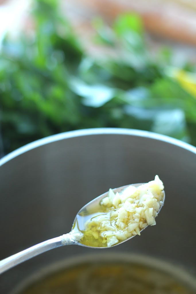 Place your oil and garlic in a medium saucepan. Set heat to medium low and set your timer for five minutes. Watch the pan closely. Around minute three or four, the oil and garlic mixture should begin to fizz and bubble. You want to let it do that, stirring occasionally for one to two minutes, until the garlic is very fragrant. Once you really smell the garlic, remove the pan from the heat. Stir in the butter, black pepper and ¼ teaspoon of the garlic salt.