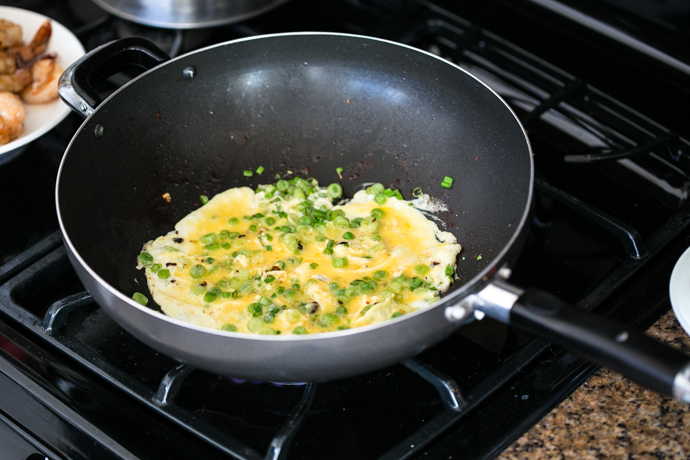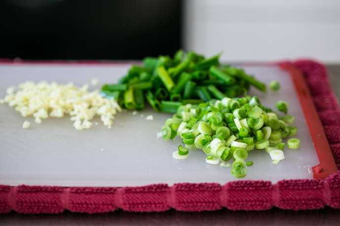 Meanwhile get your the other ingredients ready: chop green onions, keeping green and white parts separate; mince garlic; chop peanuts, and whisk eggs.