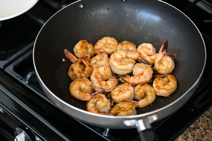 Now it’s time to put all the ingredients together. Heat a wok over medium-high heat. Add 1 tbsp. oil and then shrimp to heated oil. Be careful to drop the shrimp in as close as you can to the wok to prevent spattering. Sear shrimp for about 2 to 3 minutes on both sides until you get a beautiful caramelization. Remove shrimp from pan and set aside.