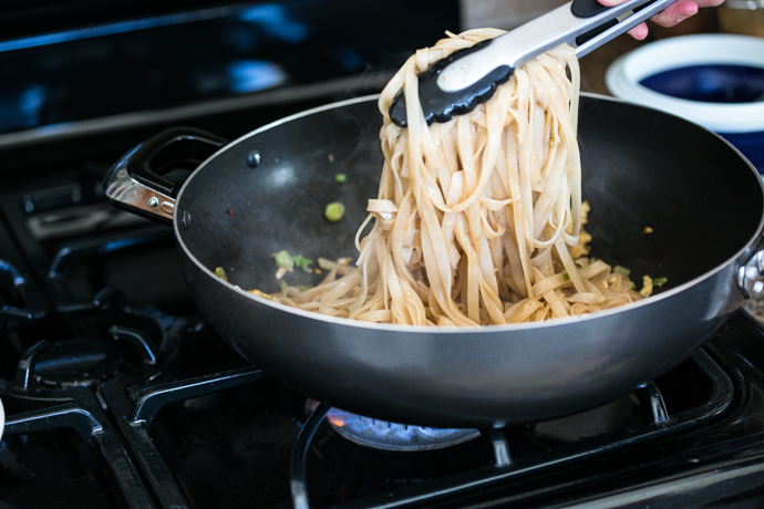 Return wok back to medium-high heat and add remaining tbsp. of oil. Add in the chopped white parts of the green onion with a dash of salt. Pour in whisked eggs and scramble lightly for about 30 seconds. Push them to the side of the wok and then add noodles. Pour in remainder of the sauce and toss your noodles with tongs and get them completely coated in your sauce. Once the noodles have absorbed all the sauce, add the shrimp back along with the green parts of the green onions and juice from half a lime.