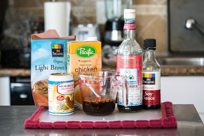 Next mix together the sauce. Combine stock, sugar, fish and soy sauces, tamarind paste and minced garlic. Marinate shrimp in about 2 to 3 tablespoons of the sauce.