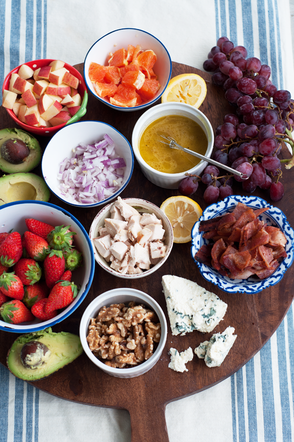 I love this salad for parties, both for the presentation of the chopped ingredients in various bowls, and for the convenience of having a dish with choices that work well for many different people. You can toss this salad as one big dish, or toss individual salads depending on your guests’ tastes. It’s a wonderful and quick meal for this time of year, when you’d rather be outside soaking up the last days of summer.