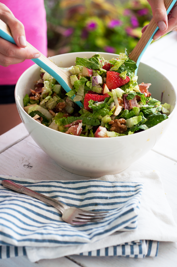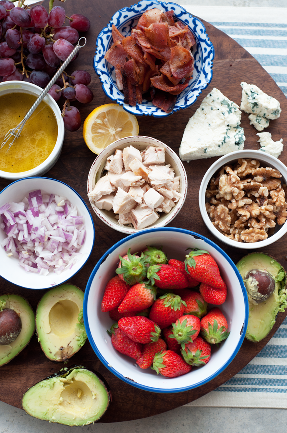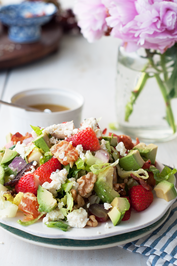 The beauty of this chopped salad is its fresh, local and seasonal ingredients. If strawberries are no longer present at farmers’ markets or grocery stores in your area, substitute blackberries, raspberries, pears, nectarines, plums or figs. The possibilities are endless, and the result is an amazing burst of flavor when paired with the avocado, gorgonzola, chicken and tangy lemon-garlic dressing.