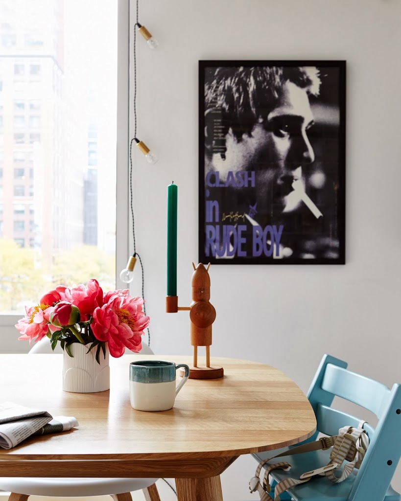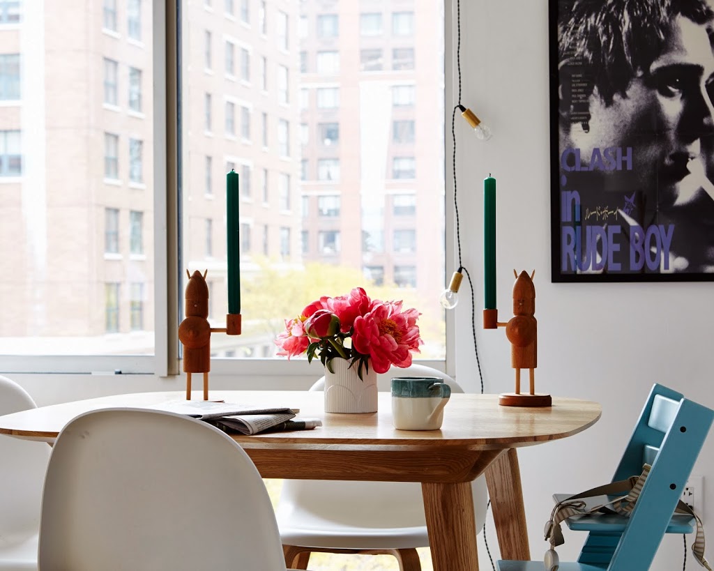 FURNITURE: Oak dining table from Design Within Reach (now sold out), dining chairs from Design Within Reach, high chair from Stokke, side table from Canvas, blocks from Land of Nod. ACCESSORIES AND LIGHTING: String lights from One Forty Three, vintage candle holders from Monki Vintage etsy shop, white scallop vase from DwellStudio, mug from Canvas, small plant pot from NYC flower district (similar), rug from Design Within Reach.