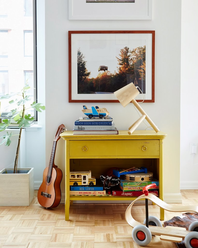 Between the living and dining areas, this yellow console—which was the TV stand in our old apartment—now holds a bunch of trucks, planes, crayons and instruments. We also have bins scattered around the apartment for the boys’ toys, including this one from West Elm. It’s funny how even when you have a bigger bedroom where your kids can play, they still want to be in the main room where all the action is! It’s so sweet.