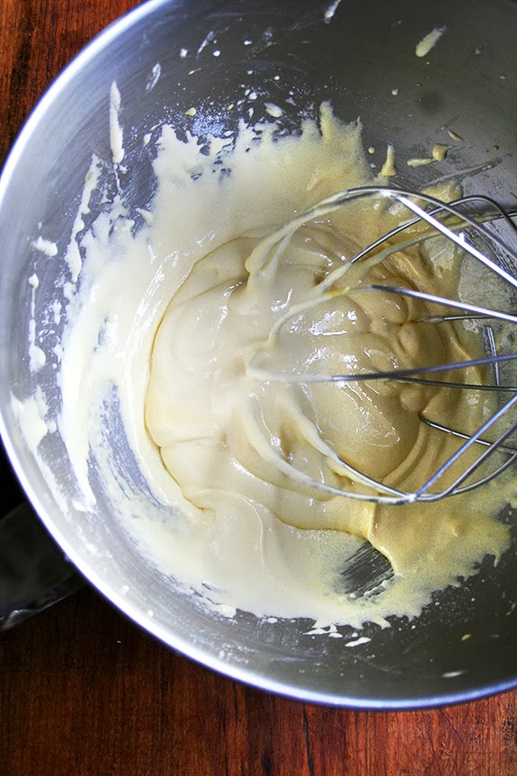 Fill a wide-mouthed pot with water about half or two-thirds full. Bring to a boil. Set mixing bowl filled with egg yolk-sugar mixture over top. Reduce heat to medium-high or medium or so that the water is just gently simmering (or less than simmering) below the bottom of the bowl. Stir the egg yolk-sugar mixture with a heat-proof spatula or wooden spoon for five minutes. Transfer mixture to a large mixing bowl.