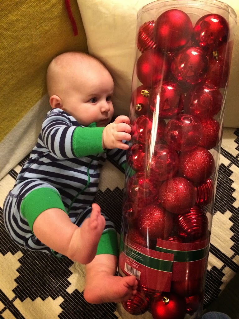 We made a plan to decorate it together that evening, so after school, Toby and I went to CVS to buy ornaments. I told him he could pick out whatever he liked, and he chose red bulbs, plastic pinecones and a gold garland. (CVS nailed it!)