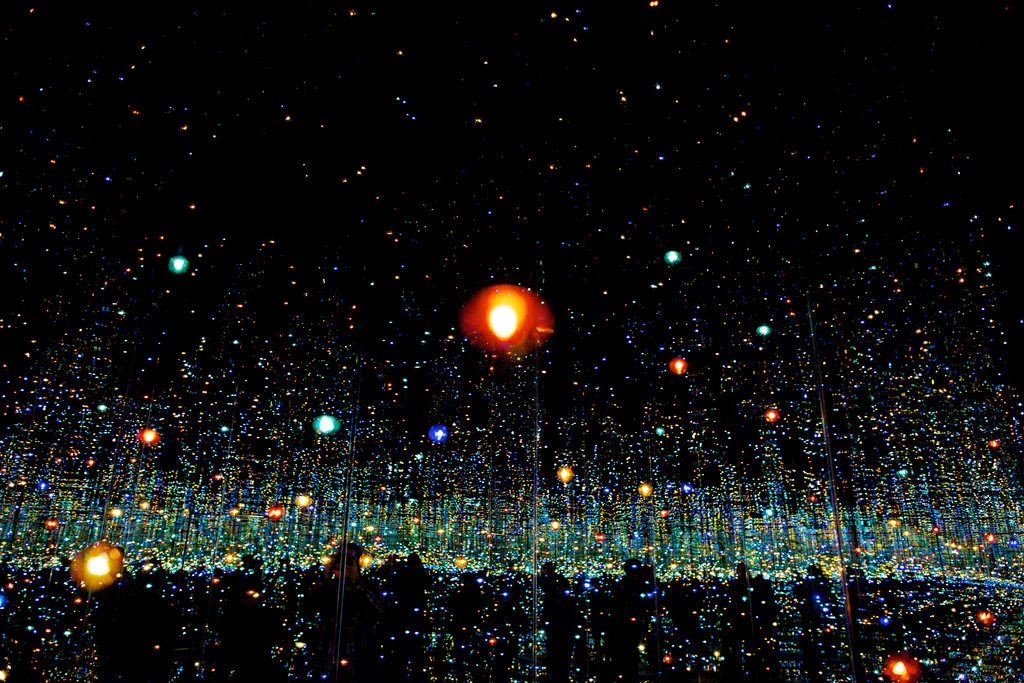 The infinity room is actually the size of a walk-in closet, but it feels much bigger because of 75 colored LED bulbs and mirror-lined walls.