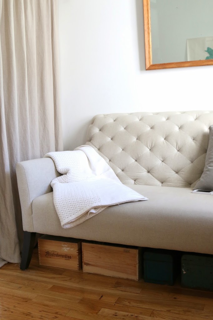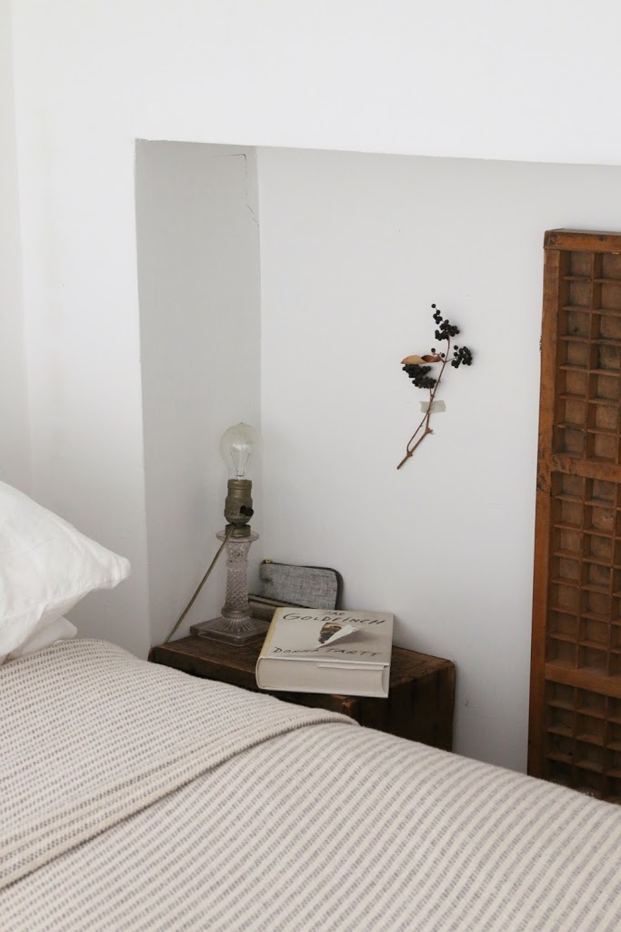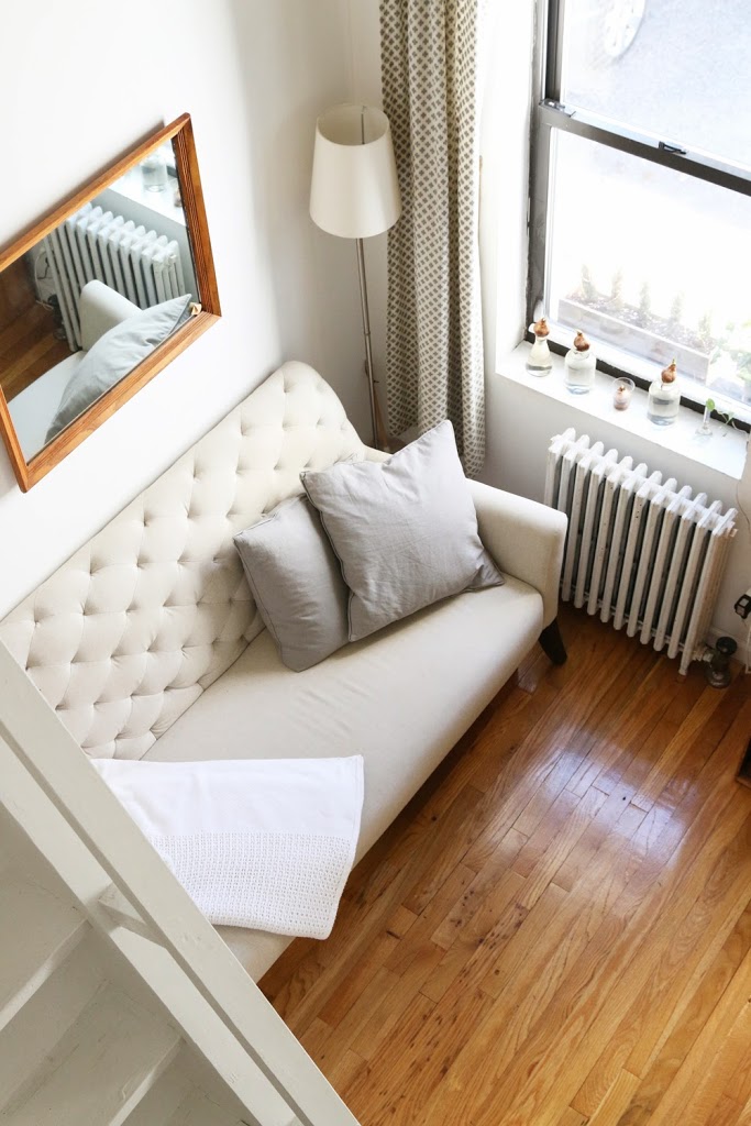 12. Keep bedding simple. We used to have a bright floral quilt, but it made our tiny loft feel tinier. We also experimented with darker sheets but returned to crisp whites. Simple bedding is easier on the eye and makes the apartment look bigger. (We love our Brahms Mount Ticking Stripe Blanket.)