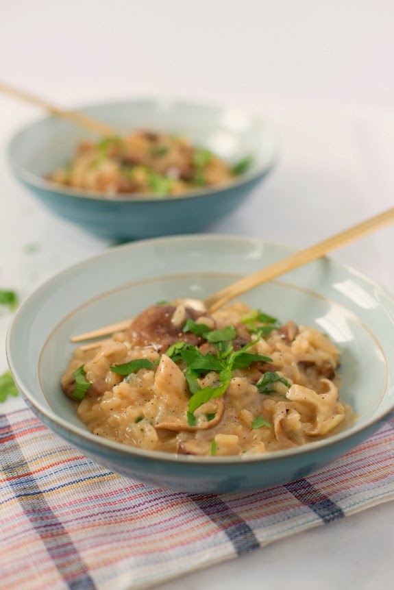 Once you’ve added the last cup of broth, stir well and add mushrooms, butter, parmesan, salt and pepper. Let sit until broth slowly evaporates and the butter and cheese melt.
