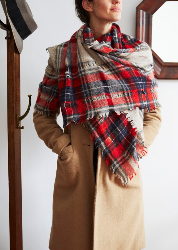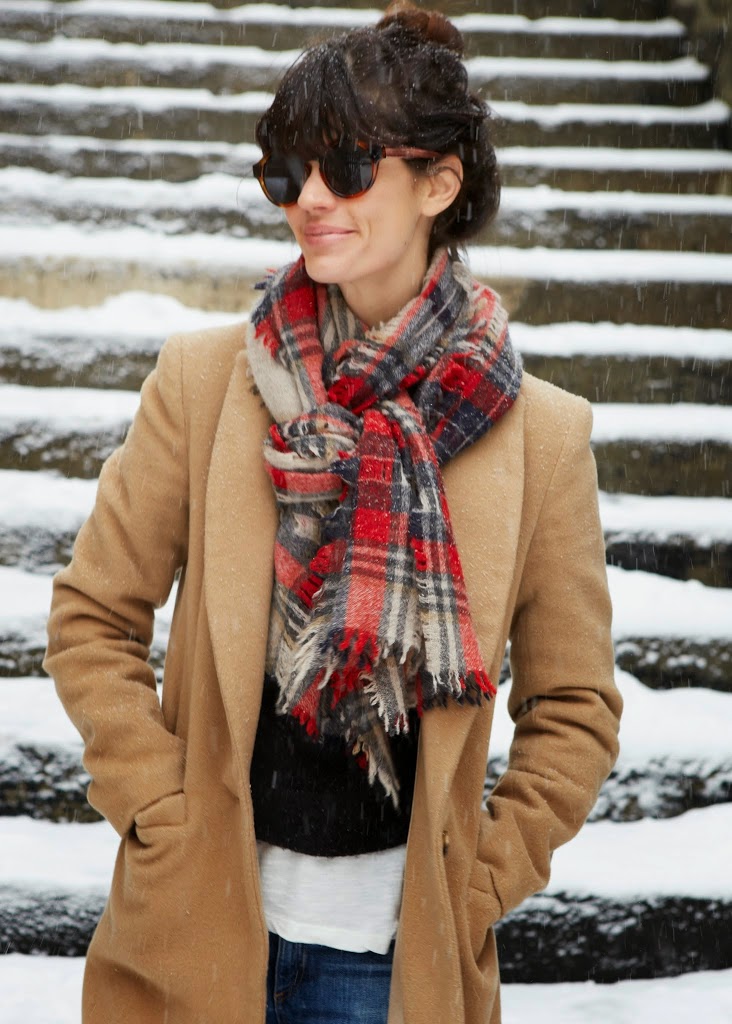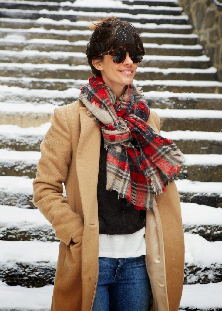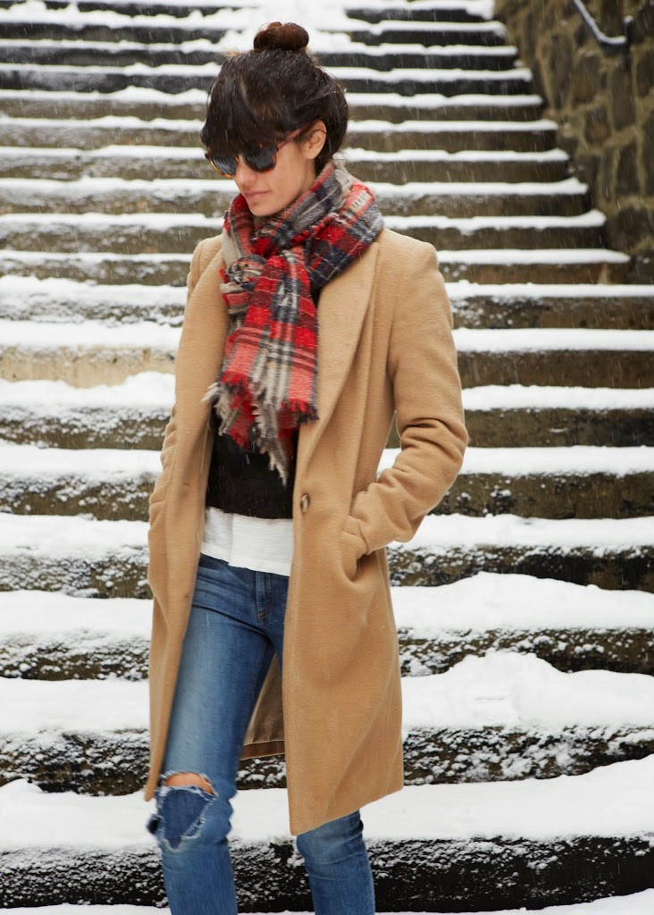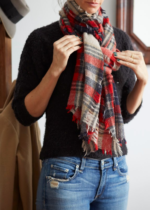 Her ripped jeans are by Rag & Bone (similar and cheaper here). Coat by Emerson Fry (similar here). Plaid scarf from Madewell (similar here and here). Textured sweater from Topshop. Green nail polish is Don’t Tell Mama. Sunglasses from Zara, similar here and here.