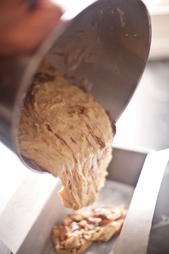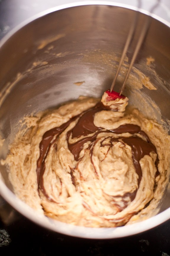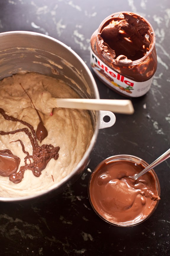Using a rubber spatula, gently fold the Nutella into the batter, trying not to over mix, so you can see the swirls when it’s baked.