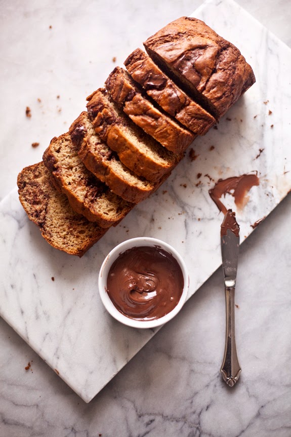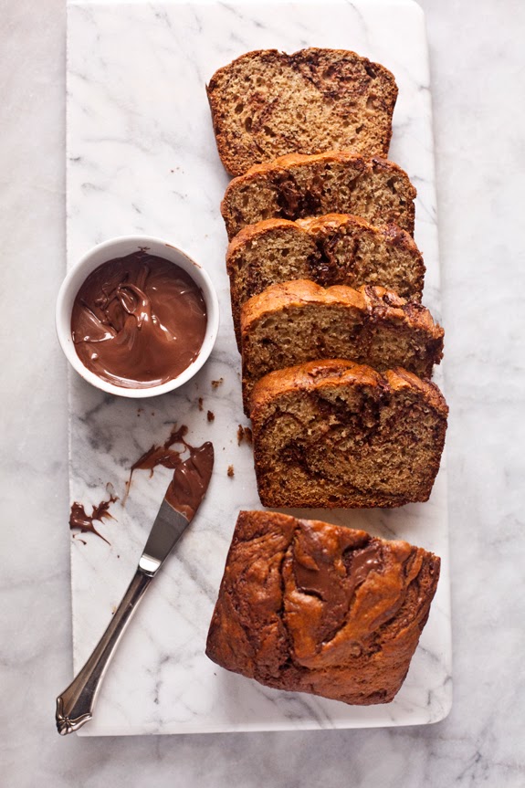 I fell for Nutella 23 years ago while staying with a French family in Paris. It was my first time abroad and I discovered many things, one of which was that French kids were the luckiest people on earth. They sailed boats in the impossibly beautiful pool at Luxembourg Gardens—and they had Nutella. Parisian children ate the spread like I consumed peanut butter: for breakfast, on bread at lunch, and as a late-night snack. But it’s made with chocolate and hazelnuts, which are so much sexier than peanuts. We Americans have finally had a Nutella revolution of our own, and I think we’re all a bit happier for it. My house is never without a jar and I’ve spread it on just about everything. One of my favorites is on freshly baked banana bread. In this recipe, I just swirled the Nutella right into the batter and baked them together. I like to make two loaves; otherwise it disappears way too quickly. My family always eats one while it’s still warm and gooey, and the other for breakfast the next day (who am I kidding, it rarely lasts that long). Something this delicious shouldn’t be this simple to make, and yet it is. Food perfection!