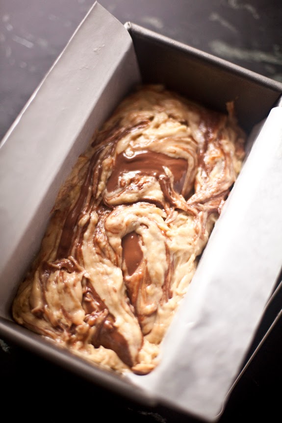 Place the Nutella in a bowl and microwave for about 20 seconds to soften it. If you don’t use a microwave, you can heat the Nutella over a double boiler for a couple of minutes. Drizzle 2/3 of the Nutella over the banana bread batter.