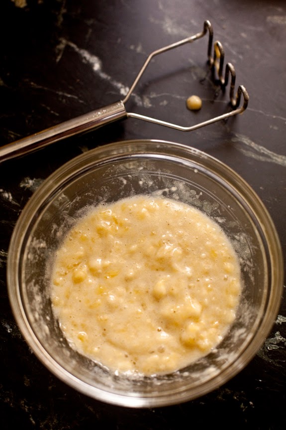 Mash the bananas with a potato masher, so they still have some small lumps, set aside.