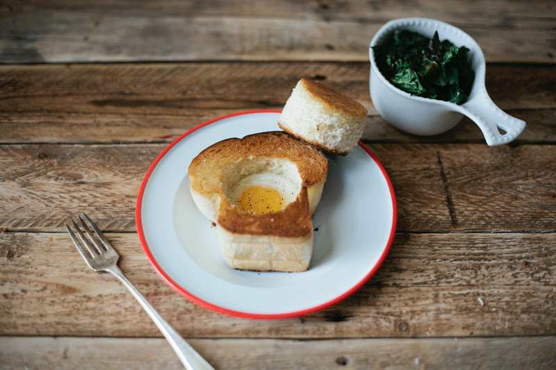 * Use a super thick slice of bread, cook your egg at the bottom of the hole (you won’t be able to flip it with this variation), and then fill the rest of the hole up with greens.