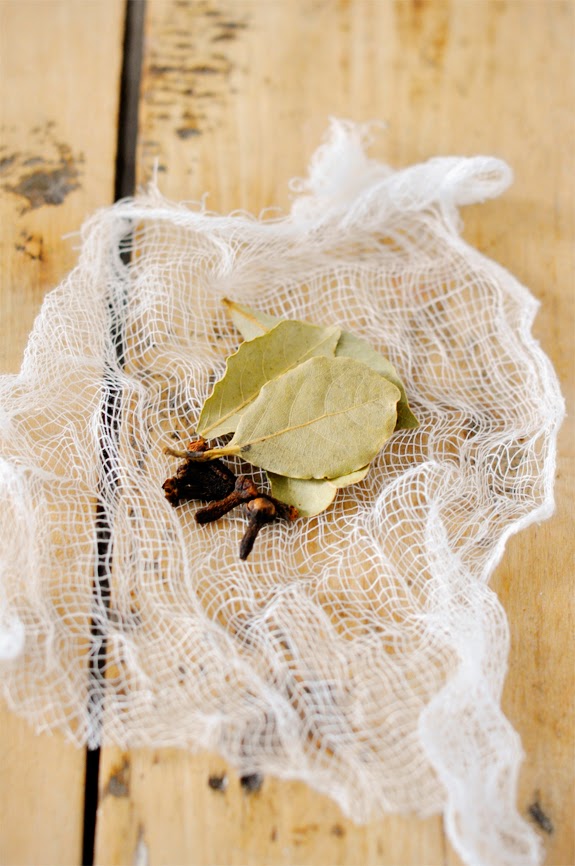 Place your bay leaves and cloves in the small square of cheesecloth, wrap and tie in a knot. Pour all the other ingredients (including your little cheesecloth bundle) into a saucepan. Cook over medium-high heat, stirring occasionally, until it comes to a simmer.
