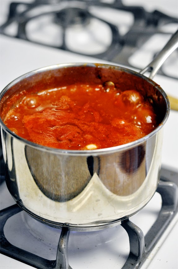 Once simmering, turn heat to medium and let bubble until mixture reduces by half (this should take 30 minutes). Stir every once in a while making sure nothing sticks to the bottom. Remove from heat and let cool completely. Dig around until you find your cheesecloth bundle and throw it out. Purée the rest in a food processor or blender until smooth.