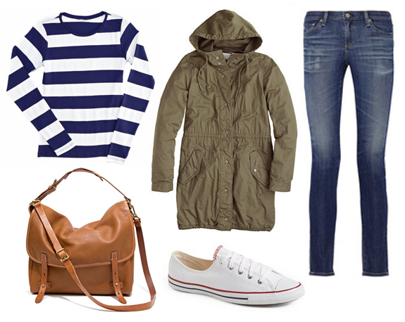 The basic uniform: an army jacket, striped shirt, ankle jeans, a leather bag and white Converse (especially this slightly thinner, less-clown-shoe version) without socks (no socks is key).