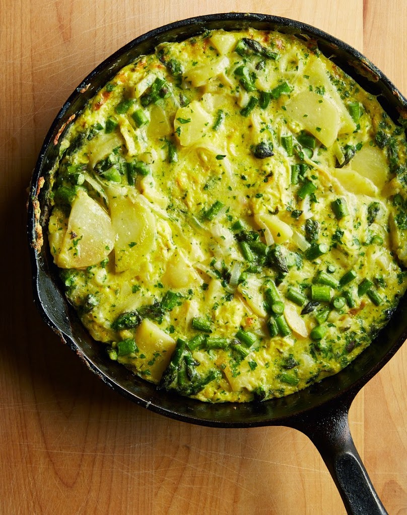Return the pan to the stove. Add 3 tbsp. of the reserved oil and the potato mixture. Beat the eggs in a large bowl, add the asparagus, herbs and salt, then pour into the pan. Let the mixture settle a bit on the bottom, then gently shake the pan to release the eggs from the bottom. Run a heatproof spatula around the edge of the pan to release the tortilla from the sides.