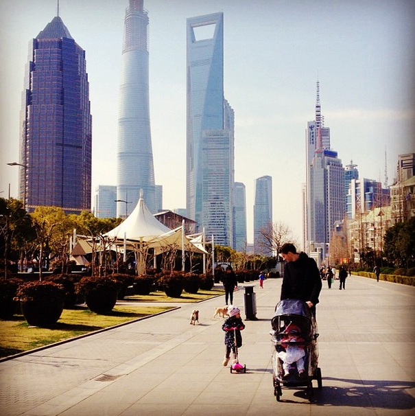 On playgrounds: We live in the heart of Shanghai, and I was initially worried that our kids wouldn’t have much space to run around. But there are so many beautiful parks and zen spaces. Older people are very active here—I love that—they walk around, do tai chi, do dance moves all in a row to music on boom boxes. It’s really cool. Older people are very respected here. While there aren’t very many playgrounds, there’s always a fish pond or space for kids to ride their scooters.