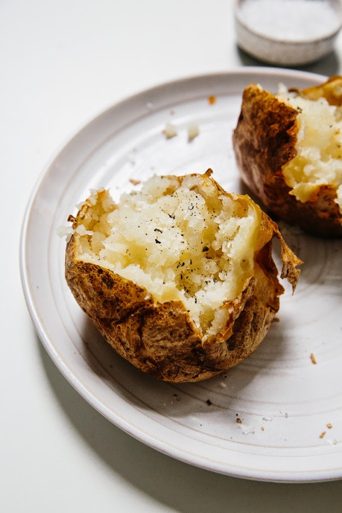 When we were visiting our family in England last week, we ate our weight in jacket potatoes. They’re different from the baked potatoes we make because they have super crispy skin and a fluffy melty inside. SO AMAZINGLY GOOD.
