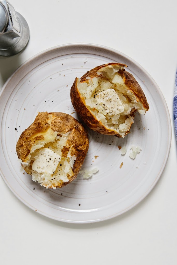 “Preheat oven to 200C/400F. Cut a cross on the potatoes. Put the potatoes at the top of the oven—straight on the rack, not a baking tray. Cook 1-2 hours (usually closer to 2). When they feel crunchy on the outside, pull the rack out, cut the potatoes open again to release the steam, then put them back into the oven. The major important thing is NOT to turn the oven down as they go soggy and lose their crunch. After ten minutes, serve immediately with shedloads of butter, salt and pepper. Perfect.”