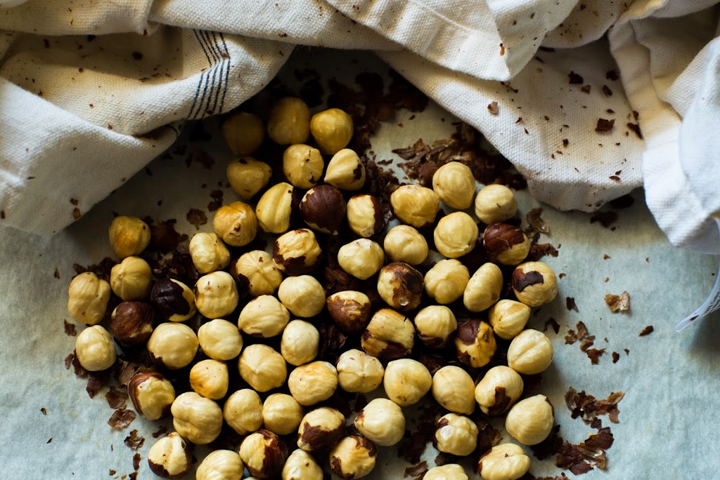 Heat oven to 375F. Put nuts on a cookie sheet and roast about 8 minutes. Remove and put on a clean towel. Rub nuts together until most of the shells come off. Chop roughly.