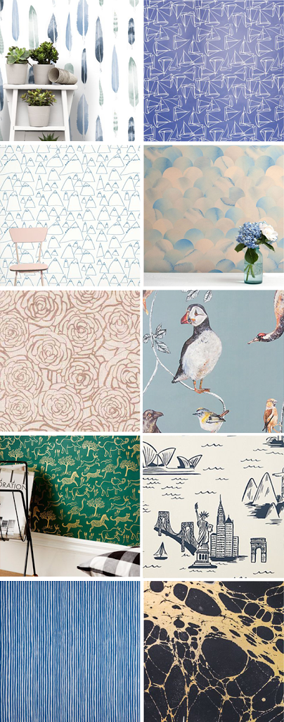 Our new apartment has two tiny bathrooms—they’re super bare bones, and only one person can squeeze in at a time. To jazz them up a little, I was thinking we could wallpaper them. But is that crazy in a rental? Here are a few pretty patterns…