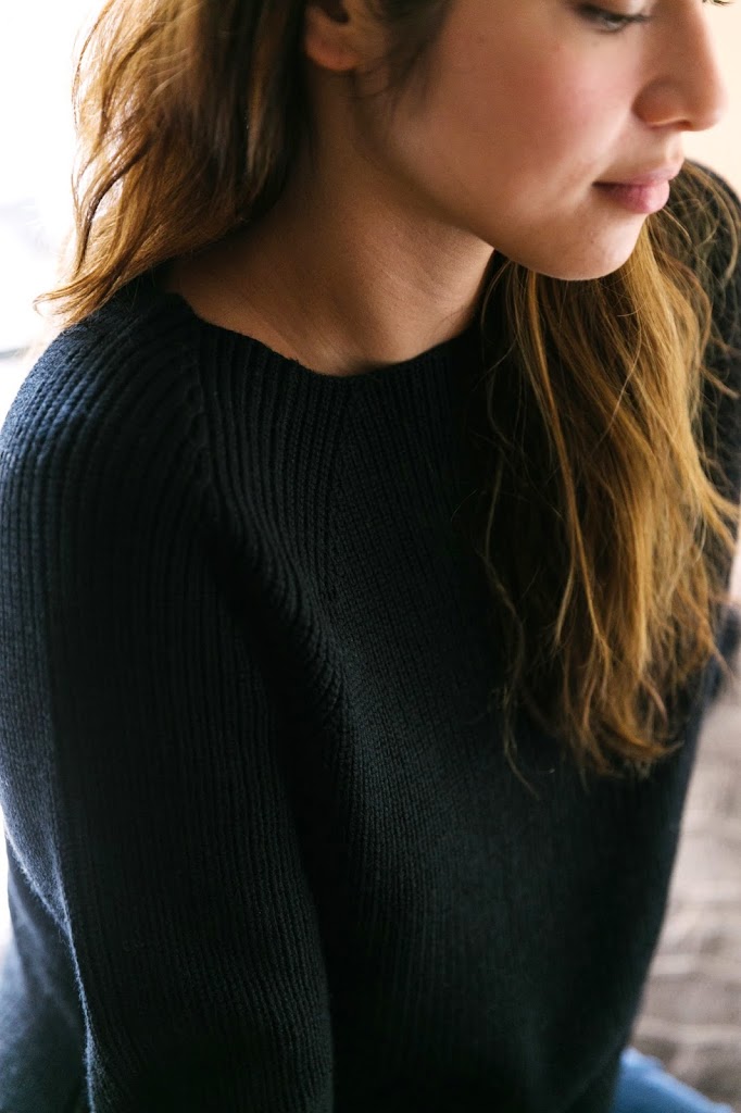 The Chunky Knit Raglan has long sleeves and a crew neck. I love how it’s tomboyish and feminine at the same time. Two other things I like about it: a) The neck is slightly wider than a regular crew, so it’s almost a boat neck, which is such a graceful shape, and b) the ribbing of the sweater goes diagonal every which way (see it here). This is the type of pretty sweater you can wear everywhere, from bike rides to work to dinner dates.