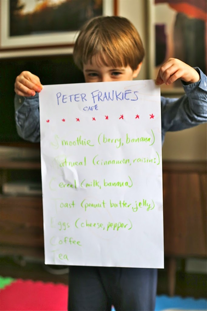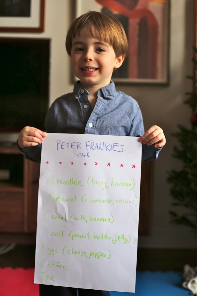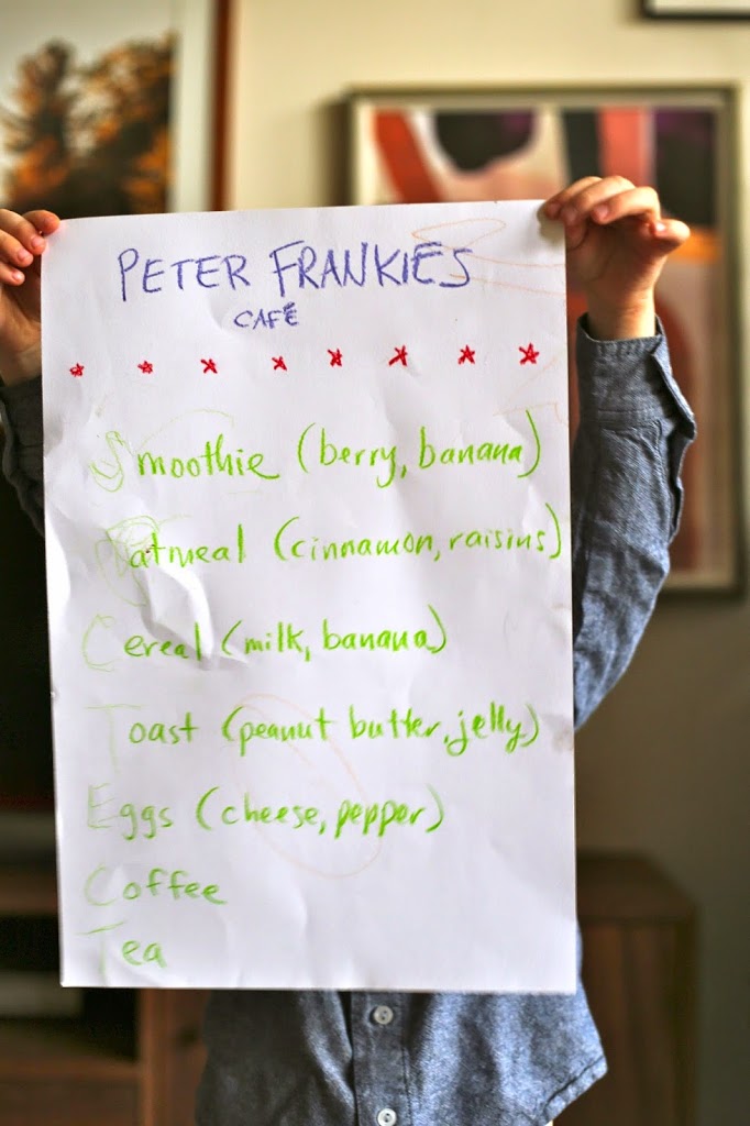 How was your weekend? My dad and aunt came to visit, and Toby, who has been getting into cooking, created a breakfast menu to present to them each morning. I asked him what he wanted to name it (“Toby’s kitchen?” “Café Toby?” I suggested), but he paused for a moment and then said, “No, Mama…it will be Peter Frankies.”