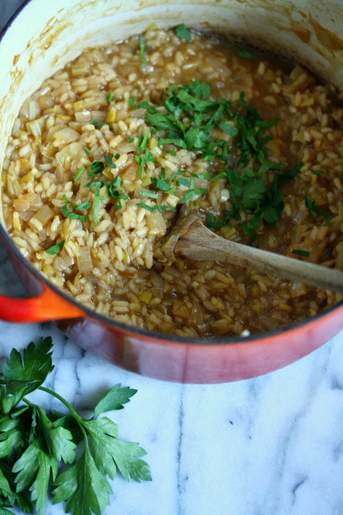 In a large Dutch oven or saucepan, heat the remaining oil. Sauté the onions and leeks over medium-high heat until soft, about 5 minutes. Add the garlic, rice, and remaining paprika. Toast the rice until the edges are opaque and the center pearly white, about 2 minutes. Add the wine and salt to the pan, scraping up any brown bits, and cook until reduced by half.