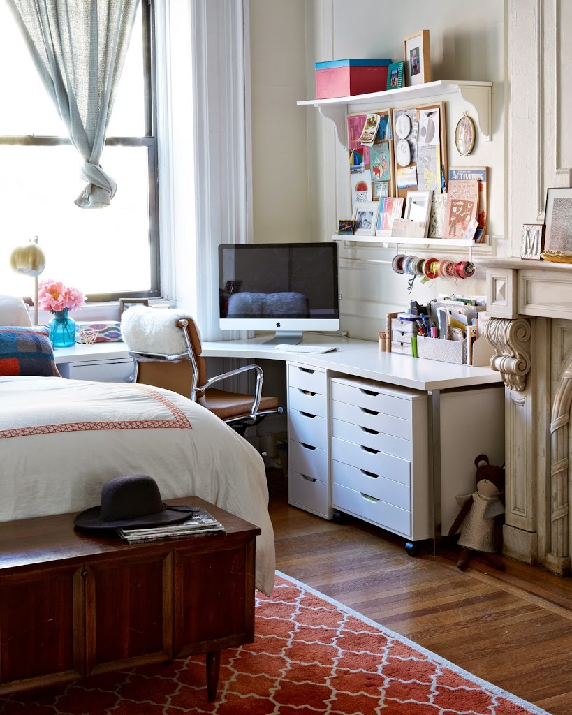 On carving out a workspace: My husband (an attorney, who works long hours) and I both needed desks in the apartment, and the bedroom was the logical place to put them. Our home projects usually come to fruition by my drawing a crappy sketch and Brian magically making it happen. He’ll get materials from Home Depot or Ikea. We placed our desks on the opposite sides of the bed from where we each sleep. My husband can sleep anywhere, but since I get insomnia really easily, I find it helpful not to sleep directly next to where I work.