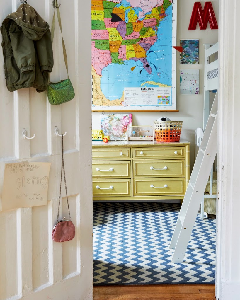 On living in a smaller space: In the summer, it bothers me less because we spend a lot of time outside or at the park. In the winter, though, it can feel small. But I remind myself that as much as we fantasize about having a laundry room or a garage or a real dishwasher, we’re choosing to forsake those things right now for the experience of living in New York City. If I feel jealous of what someone else has, I’ll remind myself ‘We went to Central Park yesterday,’ and for now, those good things outweigh the bad. While a small space obviously has its drawbacks, it also creates an environment that necessitates cooperation, creativity and problem-solving. I like the challenge of constantly experimenting and tinkering to optimize what we have. And I love the forced closeness—most of the time!
