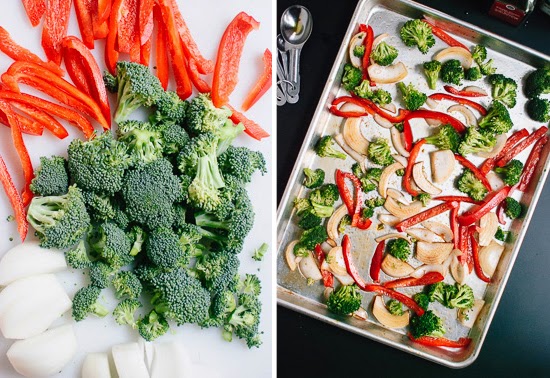 Preheat oven to 425F. Prepare your veggies, keeping in mind that you want them to be roughly the same size for even cooking. Remove the florets from the broccoli stems and slice them into bite-sized pieces. Slice the bell pepper into thin strips. Halve the onion and slice it into thin strips as well (no need to separate the strips of onion from each other).