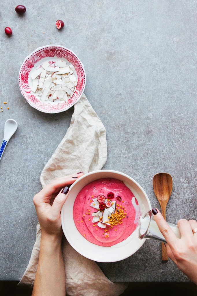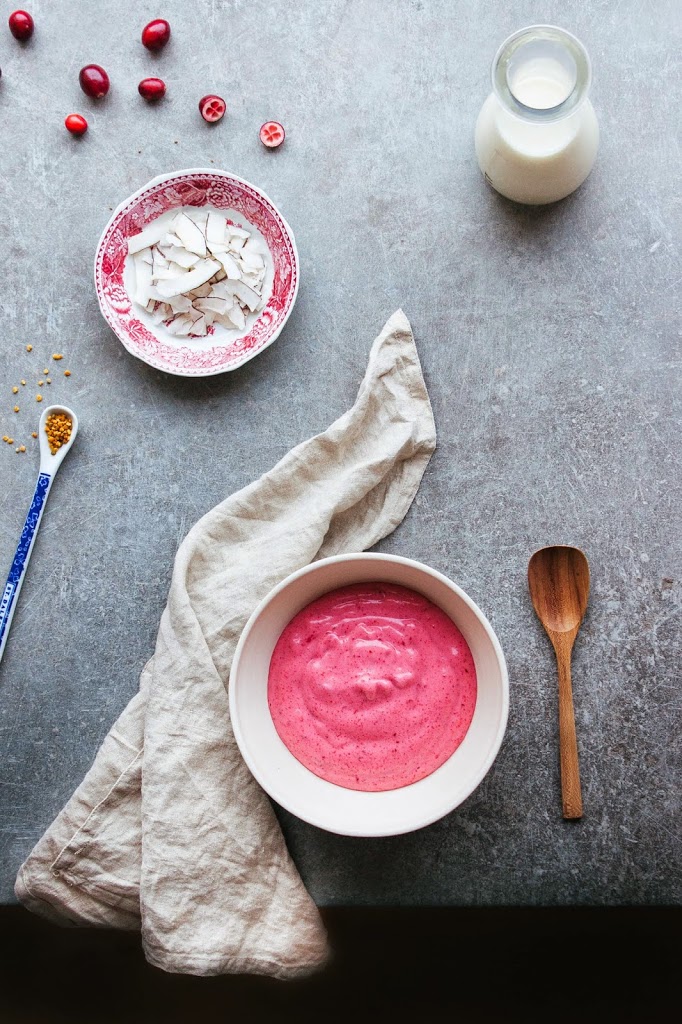 Feel free to adapt the recipe to your liking. I like to keep some of that tartness, but should you prefer it sweeter, simply use more sugar. You can substitute regular farina with whole wheat or spelt farina if you want to go an even healthier route. Whipped berry porridge is most often made with lingonberries, the Nordic counterpart of cranberries. However, you can use whatever berry you have on hand or like the most, such as black or red currants, strawberries, rhubarb or raspberries. Discover the different flavors and colors! Enjoy the porridge with milk of your choice, such as whole milk, nut milk or coconut milk. If you like, you can serve it with one or more of the following toppings: berries, toasted coconut flakes, toasted nuts or bee pollen. Whatever you choose to go for, you’ll have a delicious, vibrant and healthy start to the day!