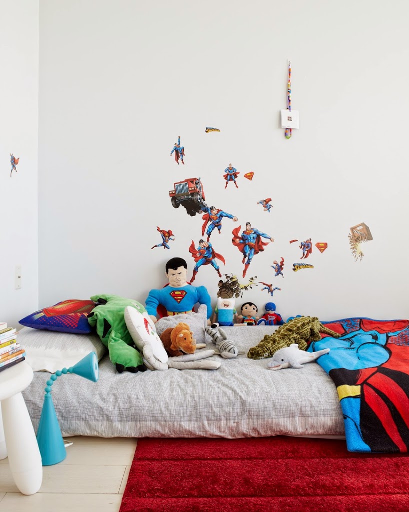 Bed: IKEA mattress. Bedding: IKEA. Gold heart pillow: I heart guts. Cube shelving: Design Within Reach.