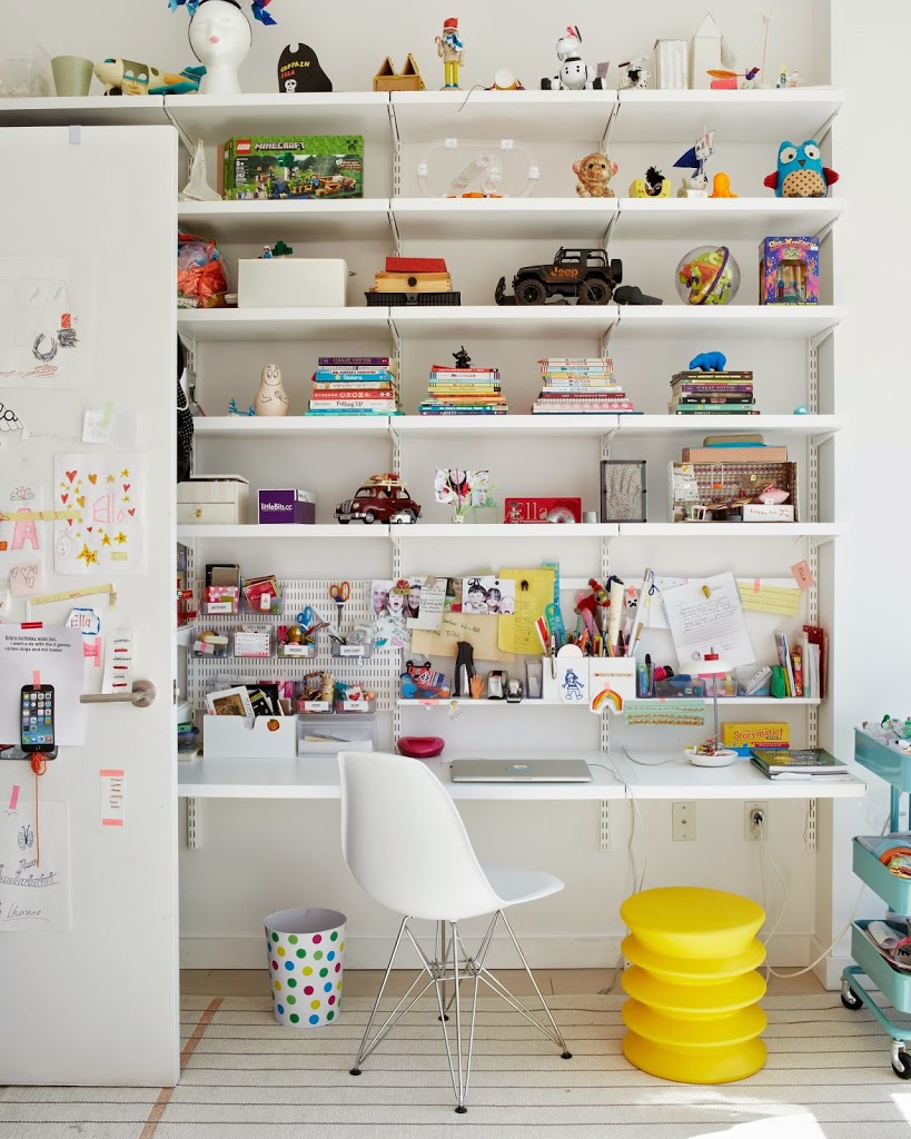 Built-in shelving: Elfa system from The Container Store. Desk chair: Eames. Yellow chair: ErgoErgo. Rolling cart: Ikea.