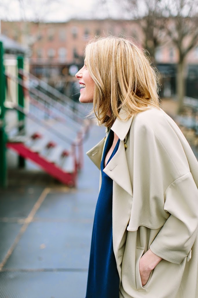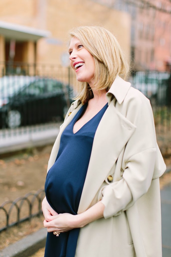 Here, Jennifer wears the Luncheon Dress (with a lovely V-neck and A-line shape) and chic double-breasted Trench. Nothing cuter over a baby bump than a trench!