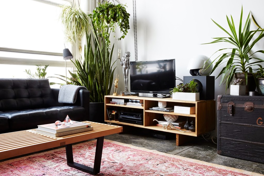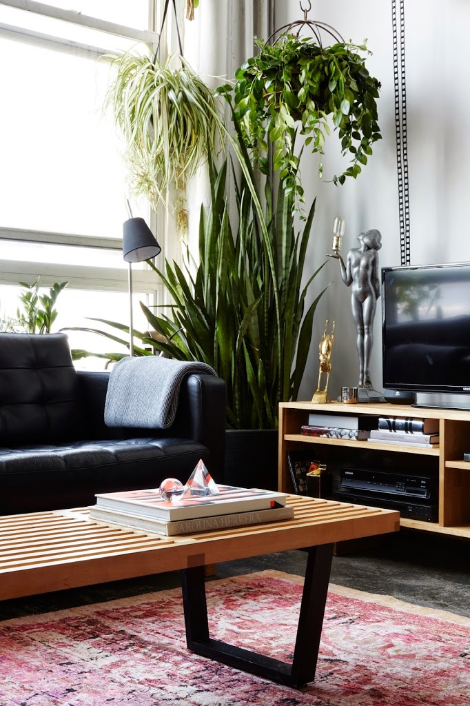 Couch: Ikea. Coffee table: George Nelson for Herman Miller. Console: Custom. Rug: ABC Carpet. Lamp: Vintage. Hanging planters: Terrain.
