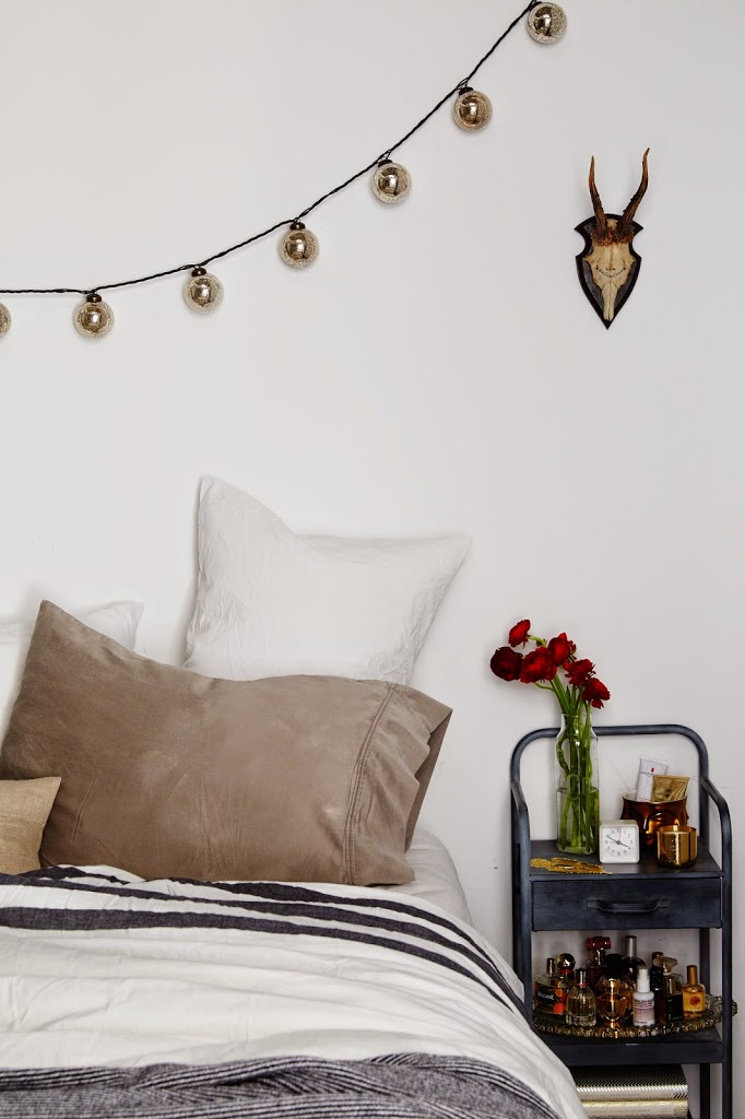 Bedding: Ikea. Nightstand: Vintage. String lights: Restoration Hardware.