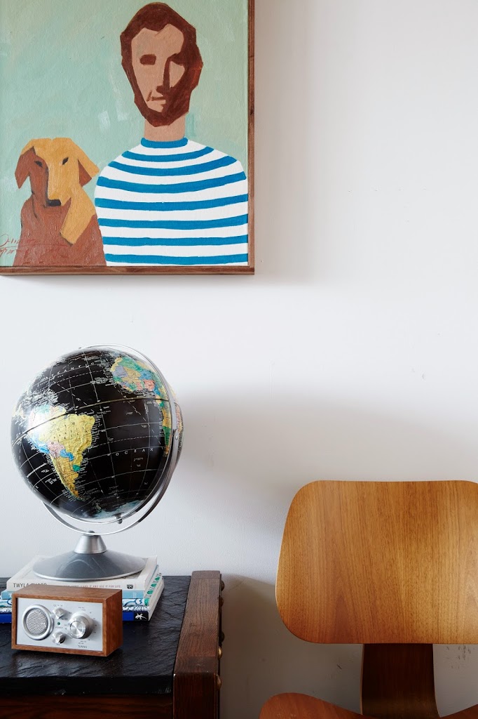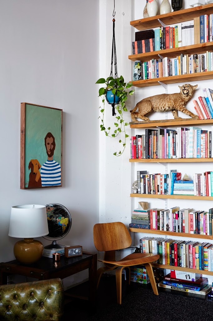Bookshelves: DIY. Chair: Eames. Globe: Vintage. Painting: Organic Moderism.