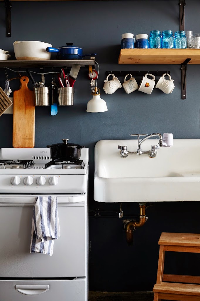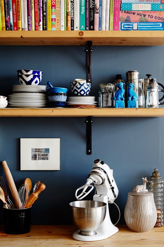 On open shelving: I have a love-hate relationship with this kitchen. For one thing, it isn’t really a kitchen–it lines one of the walls of the main living space. Instead of cabinets, there is open shelving. Open shelving keeps things feeling airy, but is a particularly dangerous feature for obsessive neatniks. Many (many) minutes have been wasted styling and arranging serve-ware. But it looks nice when it’s done!